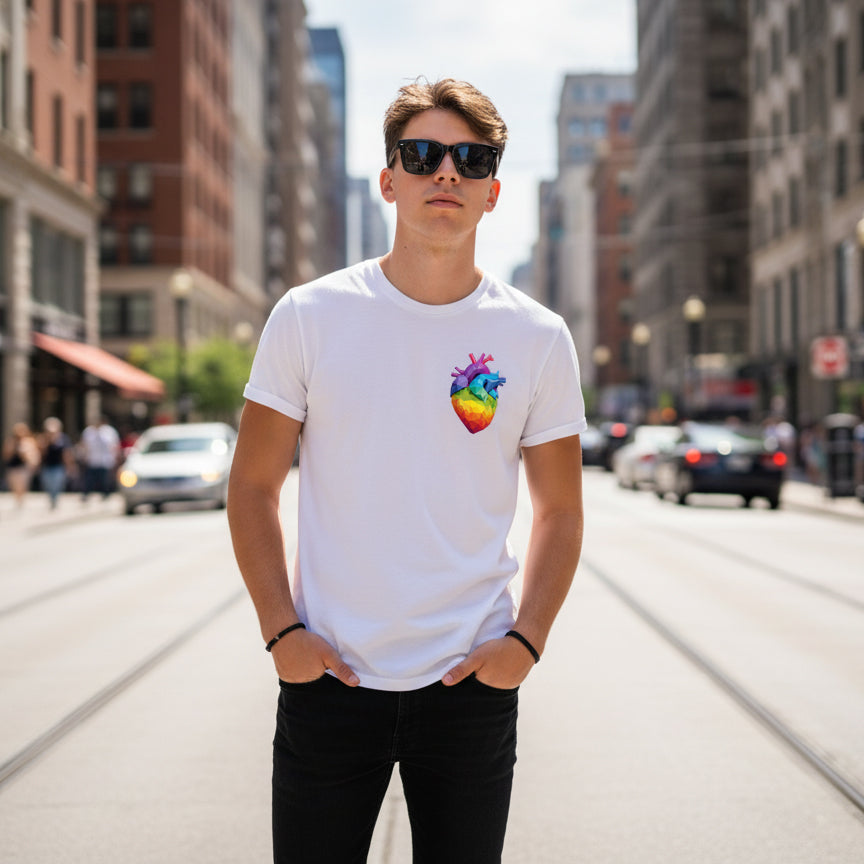 Playera manga corta estampada con un corazón geometrico de colores