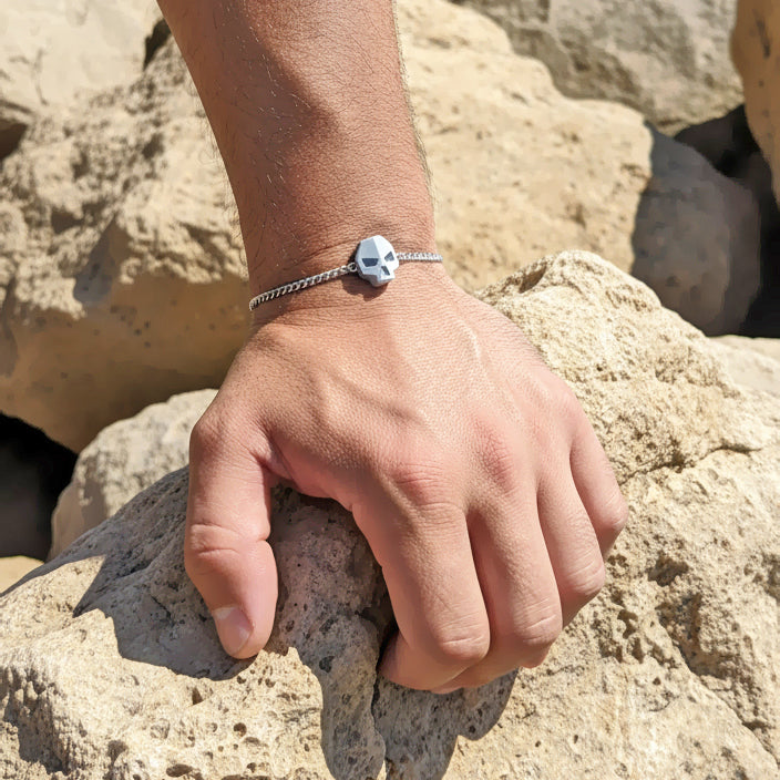 Pulsera con una pequeña calavera hecha de concreto a mano.