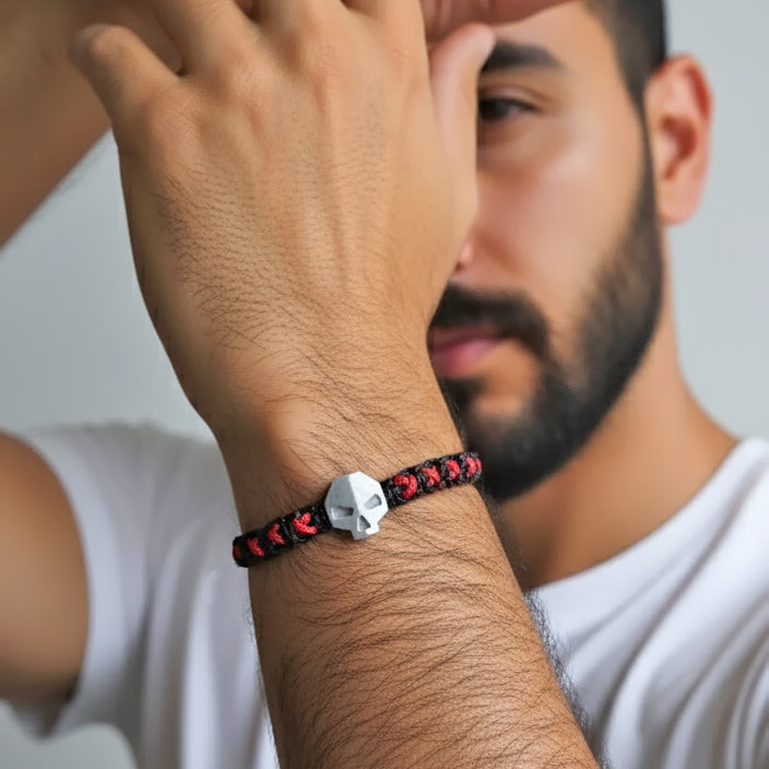 Pulsera con una pequeña calavera hecha de concreto a mano.